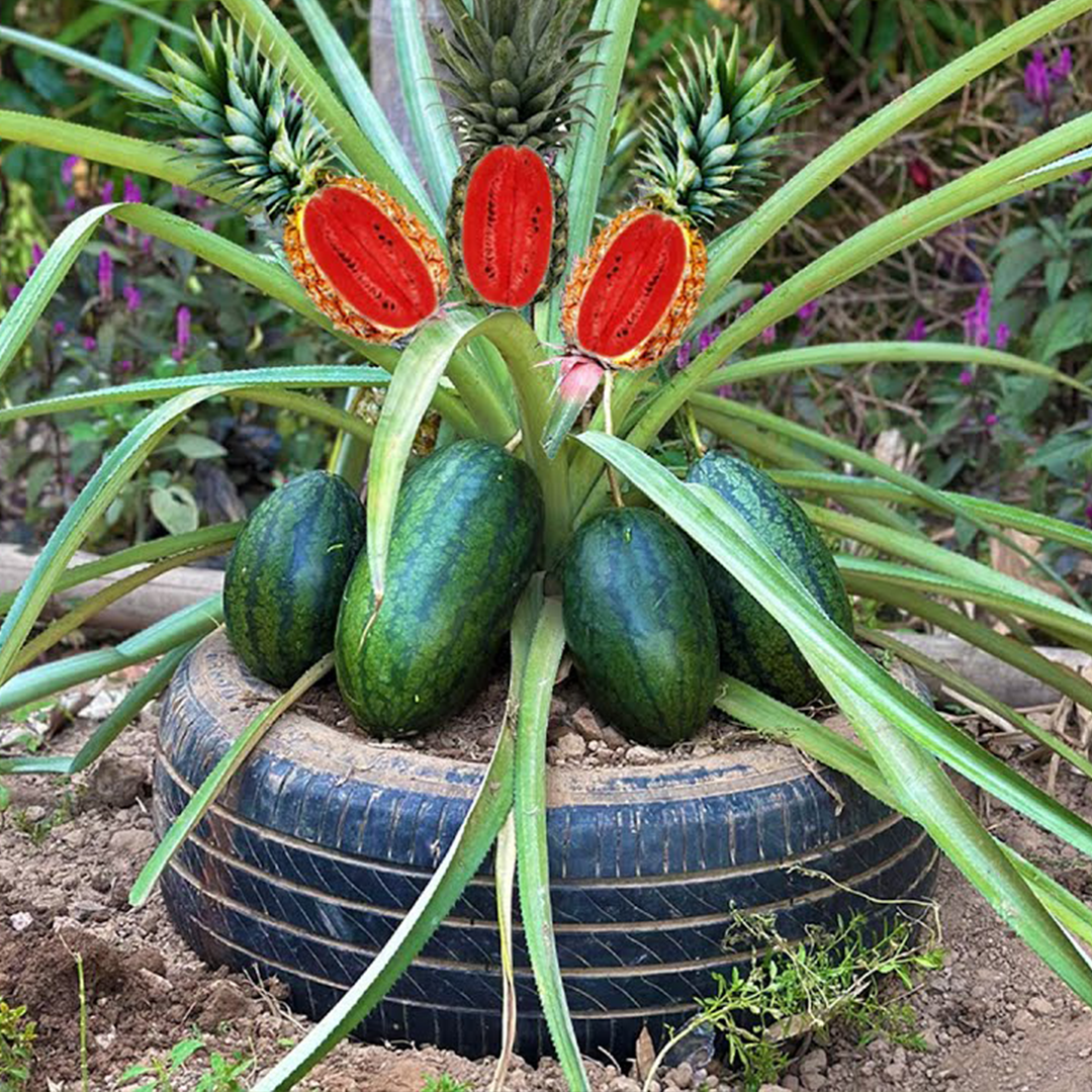 Position the pineapple at the center and allow the watermelon to grow outward as a vine. Keep the graft area slightly above soil level to prevent rotting.